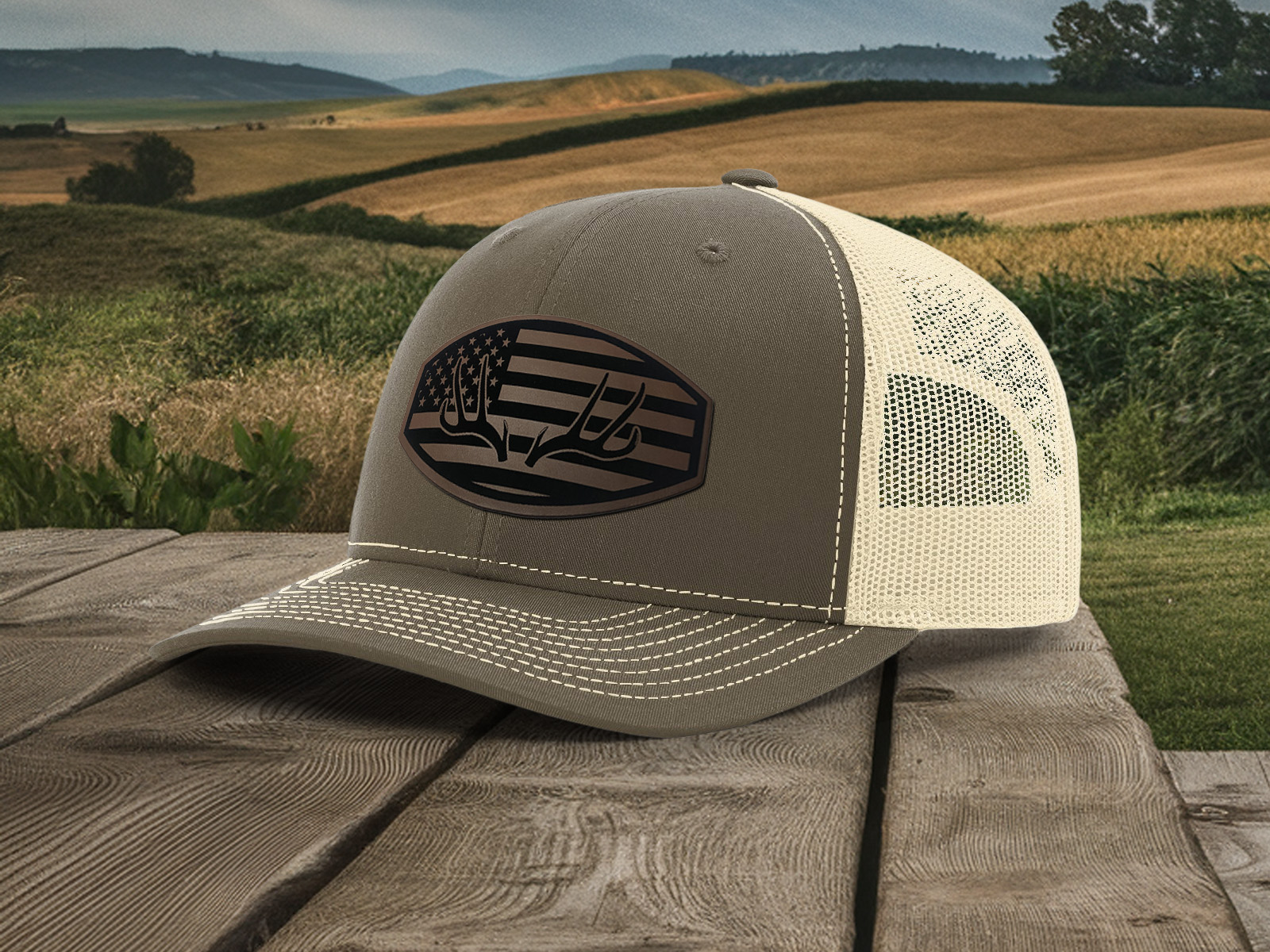 Richardson 112 Trucker hat with antlers and flag design.