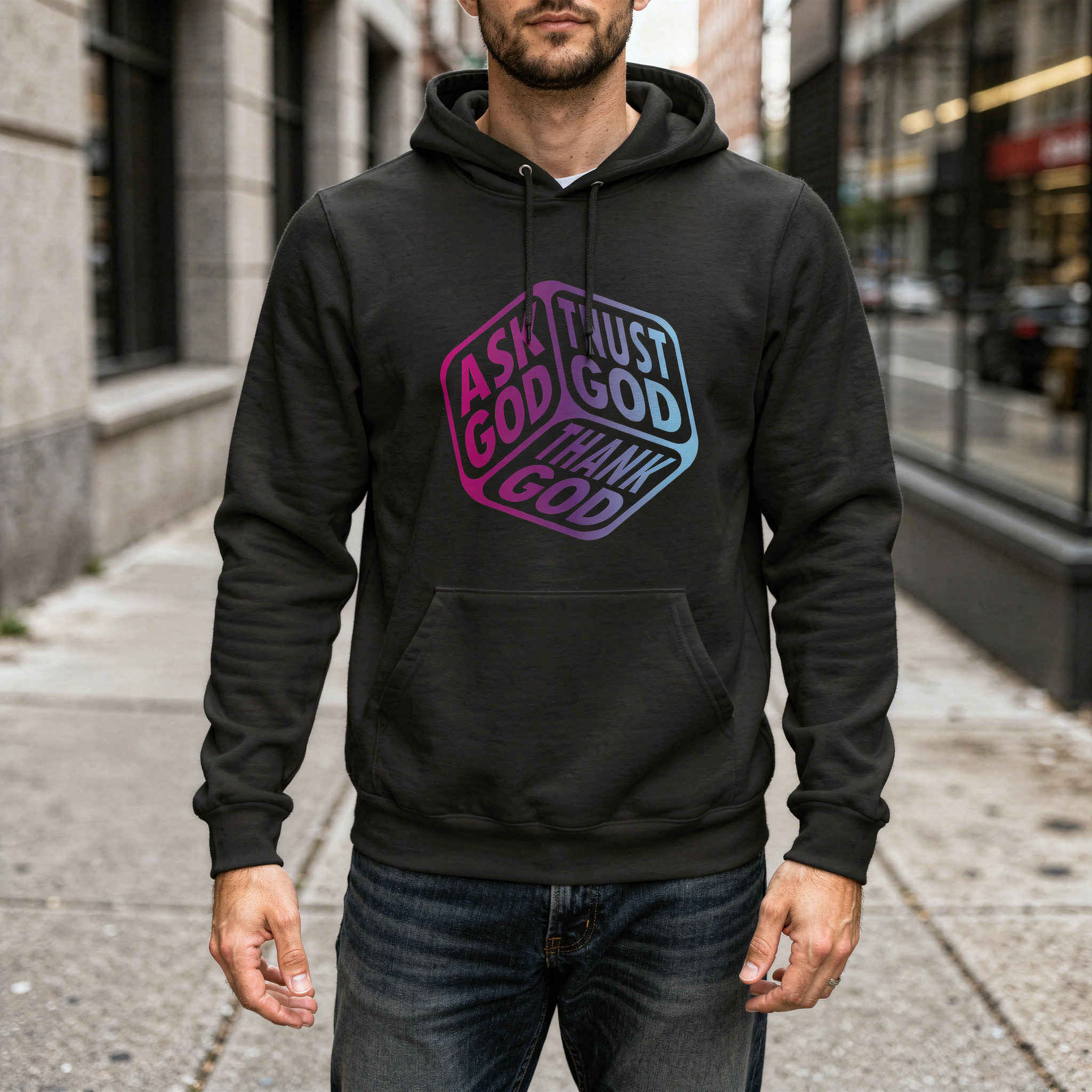 This black pullover hoodie features a bold, modern faith statement presented in a striking 3D cube design. Each face of the cube carries a powerful message—Ask God, Trust God, and Thank God—symbolizing a complete cycle of prayer and gratitude. The smooth gradient blend of purple, blue, and pink tones creates a contemporary look that stands out cleanly against the black fabric without overwhelming it.