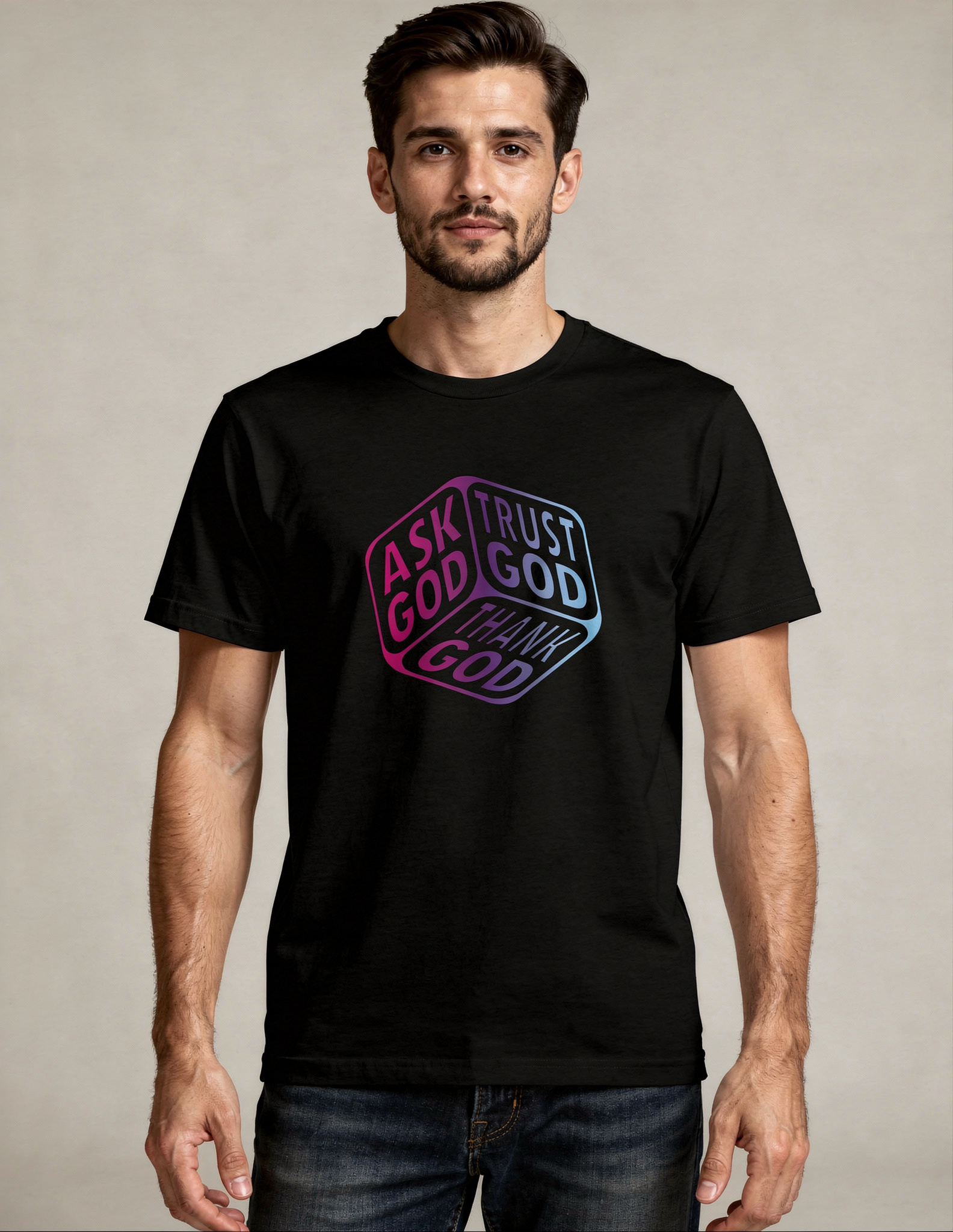This minimalist yet powerful design serves as a daily reminder to keep faith at the center of every season. Featuring a modern cube layout with a bold gradient finish, the message “Ask God. Trust God. Thank God.” is both visually striking and deeply meaningful.